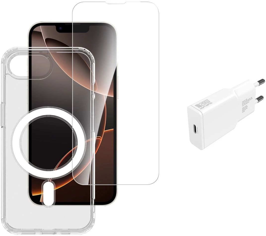 Mach den Start mit deinem neuen iPhone 16e zum Kinderspiel mit unserem 3in1 Starter-Set. Ein leistungsstarkes 20-Watt-Netzteil für schnelles Aufladen, ein 9H-Schutzglas zur Bewahrung deines Bildschirms und eine stylische MagSafe-kompatible Hülle zum Schutz und zur Präsentation deines Geräts. Ein Must-Have für jeden neuen iPhone-Besitzer, der Wert auf Schutz, Komfort und Style legt.