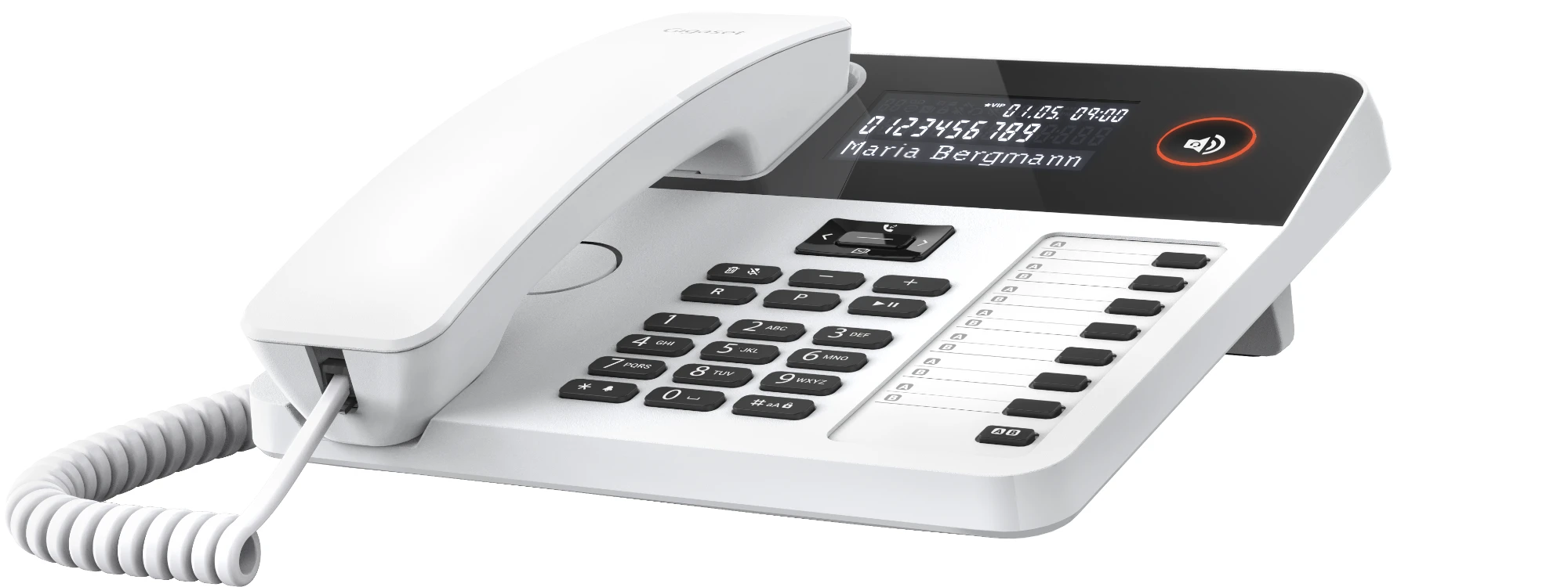 Das Gigaset DESK 600 verfügt über ein dreizeiliges LC-Display mit LED-Hintergrundbeleuchtung, das Rufnummer, Name,Gesprächszeit und VIP-Status (sofern zugeteilt) des Anrufers anzeigt. Der Startbildschirm informiert zudem über das Datum, die Uhrzeit und den Wochentag.